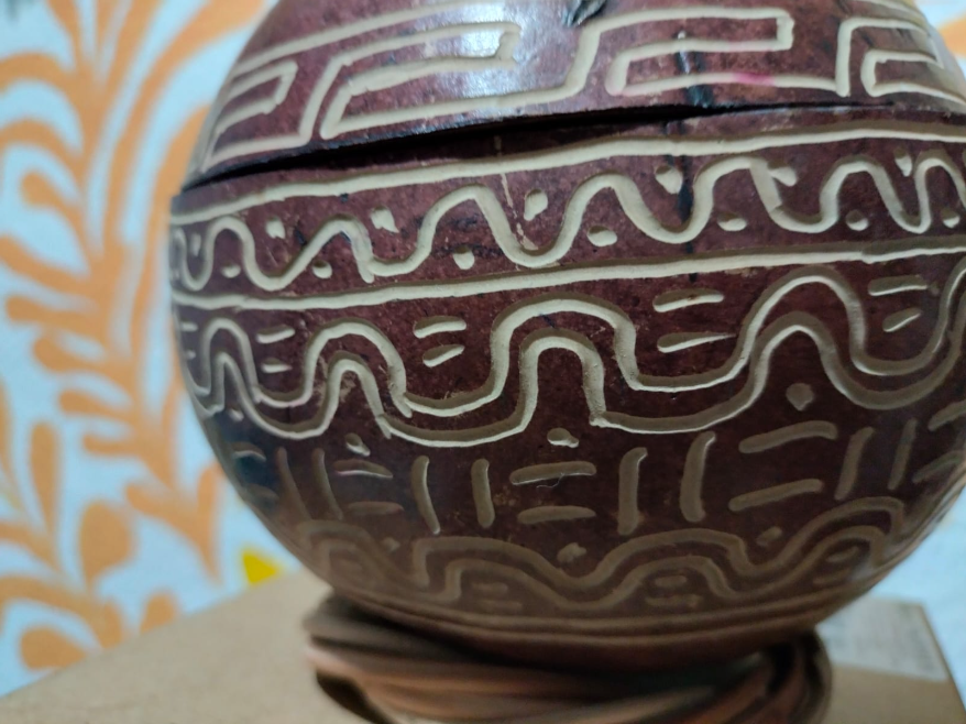 ESP (Español) La Obra: 3V∆ traslada su obsesión por la línea y la forma al plano tridimensional, utilizando la naturaleza como soporte. En esta serie, la artista interviene el fruto natural (jícara) mediante una técnica de esgrafiado de precisión. Los patrones de grecas y ondas continuas abrazan la forma esférica, creando un diálogo táctil entre la imperfección orgánica de la corteza y la exactitud matemática del diseño. Es una fusión contemporánea de artesanía tradicional y lenguaje gráfico moderno.